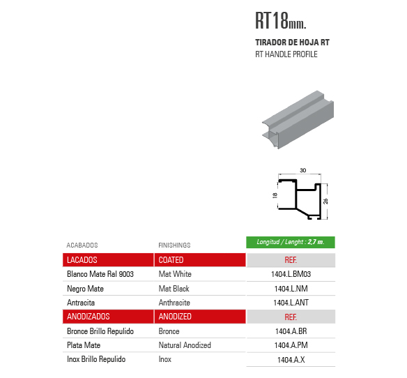 Home / Productos / SISTEMAS DE PUERTAS CORREDERAS PARA ARMARIOS / SERIE 70 / TIRADOR DE HOJA RT18mm