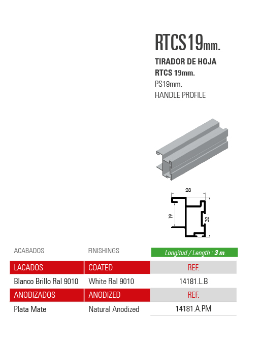 Home / Productos / SISTEMAS DE PUERTAS CORREDERAS PARA ARMARIOS / SERIE 80 / TIRADOR DE HOJA RTCS19mm.
